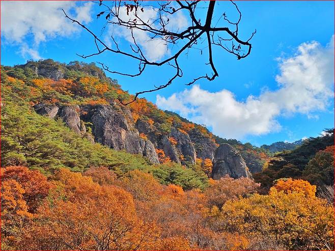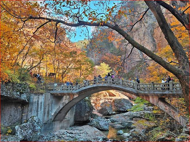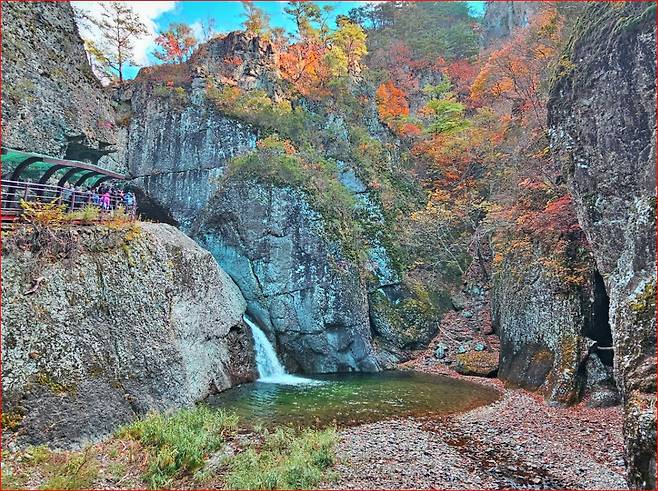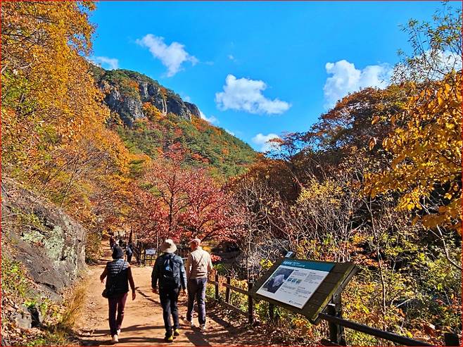길을 따라 걷다 보면 울창한 숲 사이로 계곡물이 흐르고, 가을 햇살이 바위 절벽에 반사되어 은은한 빛을 냅니다. 마지막에 만나는 용추폭포는 계곡을 따라 걷는 여정을 완성하는 화룡점정이지요.