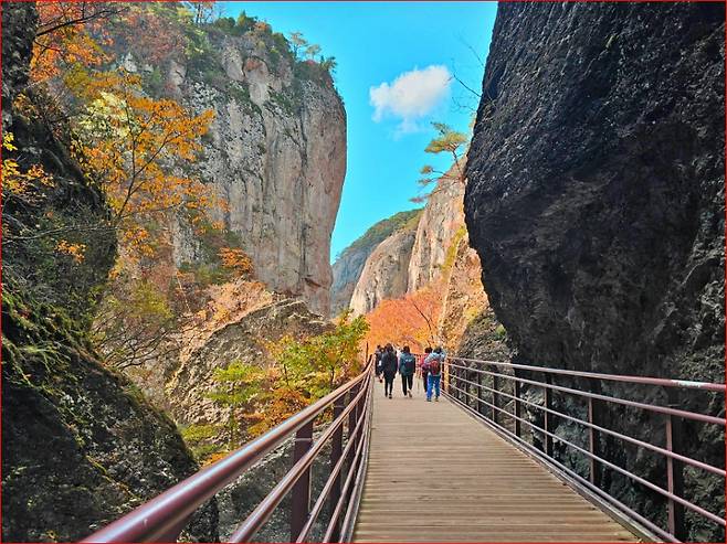 특징: 계곡변을 따라 평탄한 흙길이 이어져 있어 남녀노소 누구나 편안하게 걸을 수 있습니다.