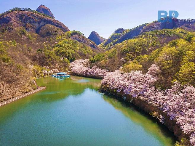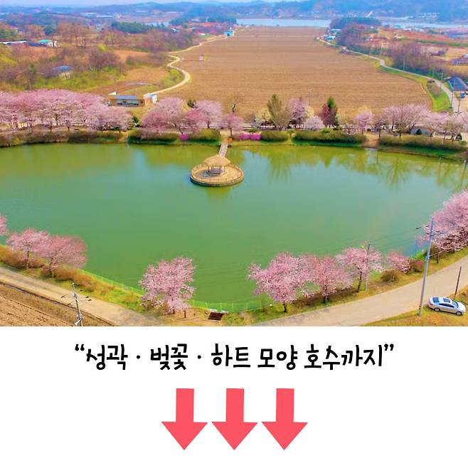 이 호숫가 주변에는 벚꽃이 줄지어 피어나 있어 벚꽃과 마이산 반영이 한데 어우러진 환상적인 풍경을 감상할 수 있다.