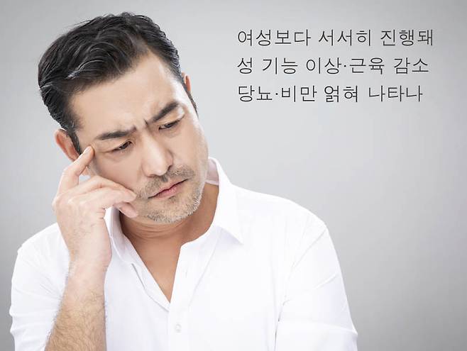 남성의 갱년기 역시 주된 원인은 호르몬 변화에 있다. 하지만 여성의 갱년기와는 다소 차이가 있다. 증상이 더 서서히 진행돼 자연스러운 노화로 오해하는 경우가 많다. 대표적인 남성 갱년기 증상으로는 성욕감퇴 및 발기부전과 같은 성 기능 이상, 우울증과 분노, 무기력감 등 정신적 증상, 근력과 근육량 감소 및 내장 지방 증가 등이 있다. 이외에도 만성피로, 불면증 및 식은땀 등의 증상이 동반될 수 있으며, 경우에 따라 다양한 증상이 복합적으로 발생하기도 한다.