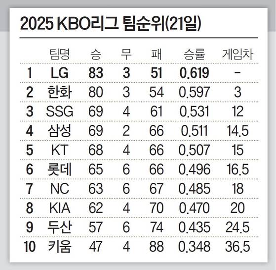 LG와 한화는 오는 26~28일 사흘간 한화의 홈인 대전 한화생명볼파크에서 격돌한다. 두 팀의 게임 차는 22일까지 3경기. LG가 83승3무51패(승률 0.619)로 80승3무54패(승률 0.597)의 한화에 앞서 있다.