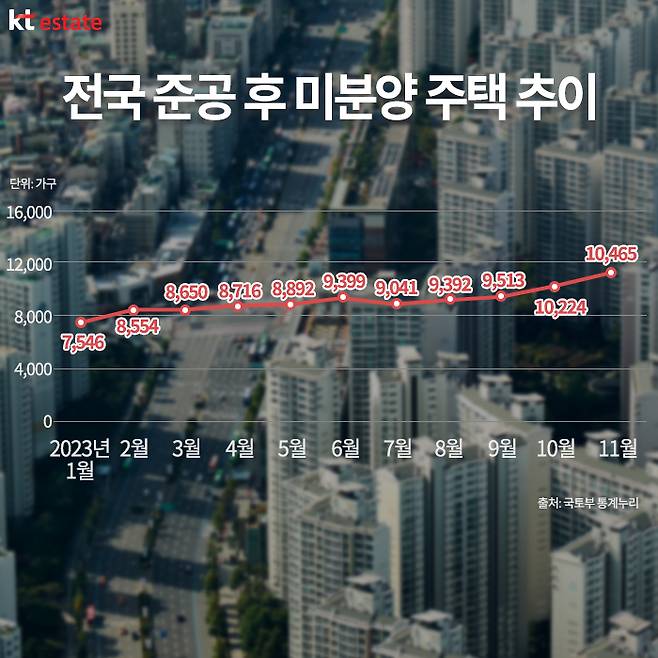 국토부 통계누리 ‘전국 미분양주택 현황’에 따르면, 준공 후 미분양은 지난해 1월 7518가구에서 10월 들어 1만224가구로 드디어 1만 가구를 돌파했으며, 11월에는 1만465가구로 늘어난 바 있습니다. 이러한 추세는 올해 초까지 계속 증가세를 보일 전망이라 우려를 낳고 있는데요.