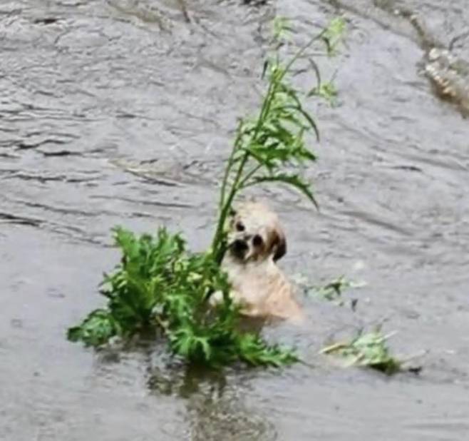 The Dodo에 따르면 미국에서 한 시민이 침수된 습지 속에서 작은 강아지가 갈대에 매달린 채 떠내려가지 않으려 버티고 있는 모습을 발견했다. 물살이 거센 환경 속에서 떨고 있었다.