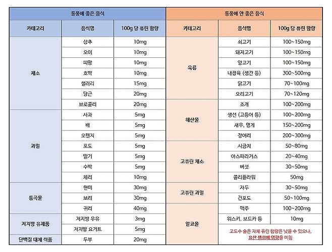- 통풍 관리 = 요산 수치 관리, 핵심 키워드는 ‘저퓨린’