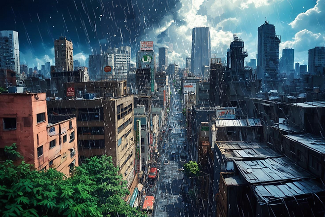신카이 마코토 감독 특유의 ‘빛과 공기감’이 매우 잘 표현된 작품인 날씨의 아이. 비 오는 도쿄 거리, 물에 젖은 건물, 구름 사이로 뜨는 태양 같은 장면은 실사로 구현하면 미친 퀄리티로 나올 가능성 있습니다. 드론+CG로 연출하면 아름다운 풍경이~?