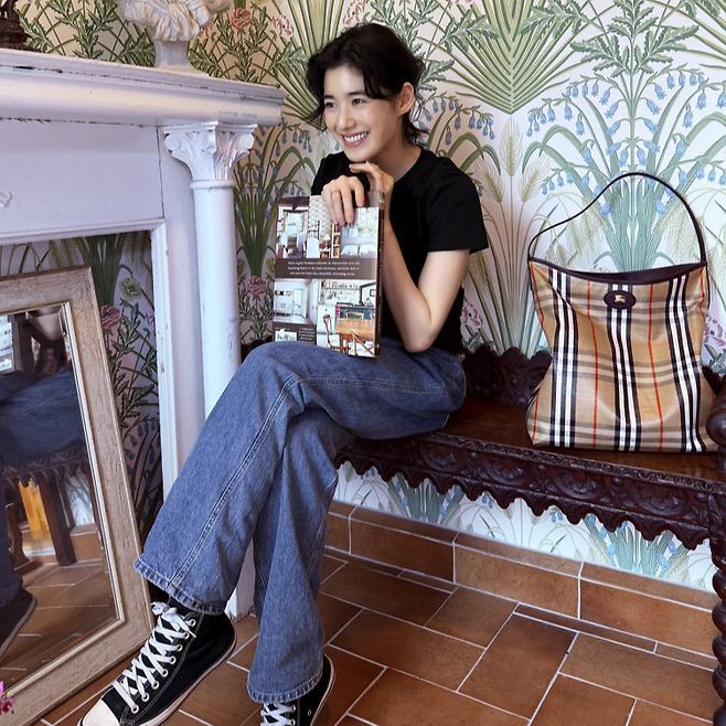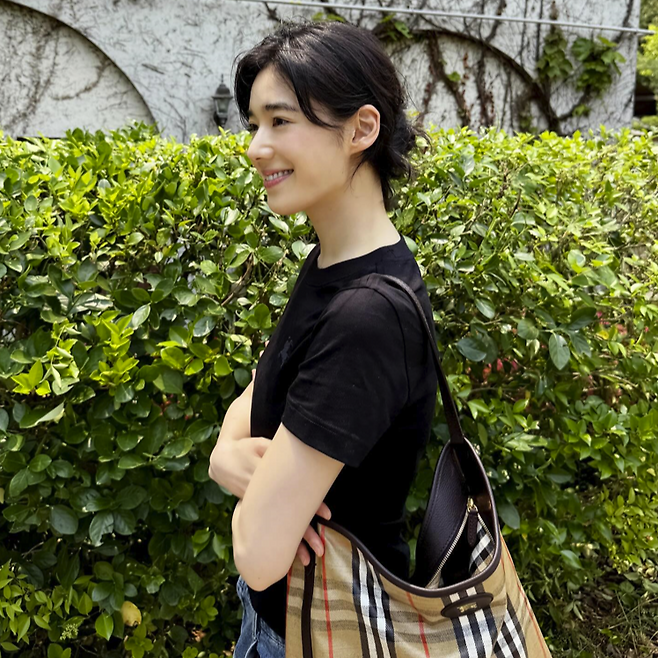 버버리 가방의 클래식한 디자인과 함께 조화를 이루는 의상들은 여배우 특유의 우아함을 강조하며, 일상적인 룩에서도 특별한 느낌을 줍니다.