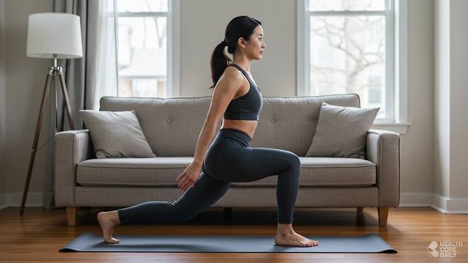 런지는 대퇴사두근과 대둔근, 종아리까지 아우르는 종합 하체 운동이다. 좌우 균형을 잡아주고, 관절 주변을 단단하게 만드는 데 효과적이다. 하체의 유연성과 힘을 함께 끌어올릴 수 있다.