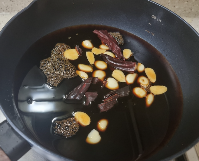 육수에 매실청, 간장, 식초, 마늘, 생강, 청양고추를 넣고 한소끔 끓인 뒤 완전히 식힙니다.