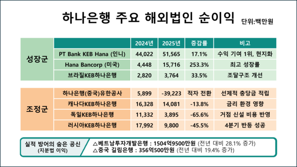 반면 동남아와 미주 지역은 실적을 끌어올렸다. 인도네시아 법인 PT Bank KEB Hana는 515억6500만원 순이익을 기록하며 하나은행의 해외법인 가운데 가장 큰 규모의 이익을 냈다. 비용 효율화와 대출 자산 확대에 따른 이자이익 증가가 영향을 미쳤다. 브라질 법인도 28억2000만원에서 37억6400만원으로 순이익이 늘었다. 핵심 예수금 증가를 기반으로 조달 구조를 개선하면서 이자이익이 확대됐다.