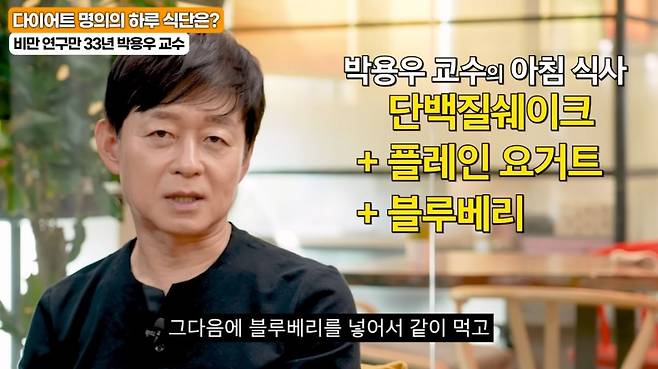 박 전문의는 아침 식사로 단백질 위주의 식단을 권한다. 그는 직접 실천 중인 식단으로 플레인 요거트와 블루베리를 섞은 단백질 쉐이크를 소개했다. 점심은 반드시 밥, 채소, 단백질 반찬을 갖춘 구성이고, 오후 간식으로는 무가당 두유와 삶은 달걀을 추천한다.