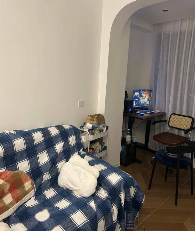 카메라를 조금 뒤로 이동하면, 바로 옆에 편안해 보이는 소파가 눈에 들어옵니다. 대부분의 고양이라면 의심 없이 소파의 부드러운 쿠션 위에서 잠들 것입니다. 하지만 야옹야옹이는 왜 그렇게 넓고 포근한 소파를 무시하고 굳이 선반 위 좁은 공간을 고집하는 걸까요?