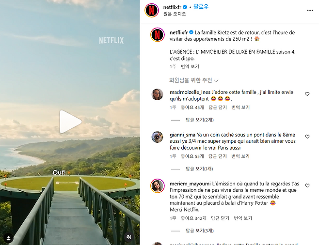 하지만 이 공식을 철저히 깨부스는 넷플릭스 시리즈가 있습니다. 바로 "라장스 (L'agence) : 드림하우스로 초대합니다."인데요. 온 가족이 함께 부동산 중개업을 하는 파리의 크레츠 패밀리 일상을 다루는 '인간극장'입니다. 프랑스와 유럽을 누비며 고객이 원하는 최고급 집을 찾아주는 내용인데요.