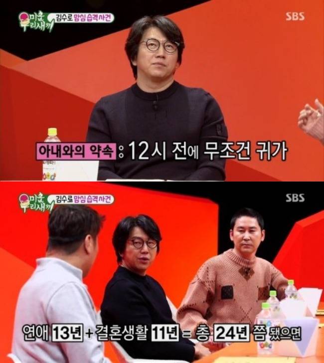 김수로는 "자정 전에 무조건 귀가하는 것이 아내와의 약속이며 11년째 지키고 있다"고 밝혀 주위를 놀라게 했습니다.