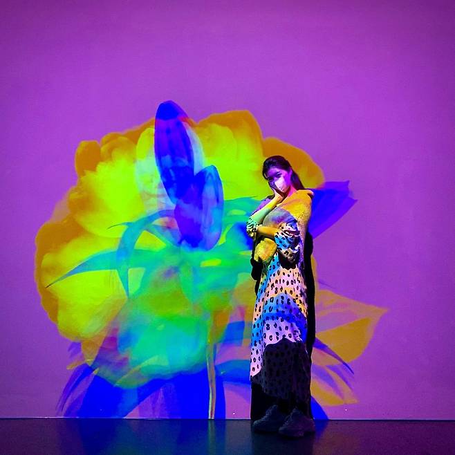 레인보우 정윤혜의 아트 전시 룩을 살펴보겠다. 정윤혜는 화려한 추상 플라워 패턴이 투영된 벽 앞에서, 독특한 패턴의 롱 원피스와 옐로 컬러 니트 머플러를 매치해 감각적인 분위기를 연출하고 있다. 원피스의 도트와 애니멀 프린트가 조화를 이루며, 밝은 색감과 과감한 패턴이 예술적 공간과 어우러져 독특한 스타일을 완성한다. 전체적으로 자유롭고 창의적인 무드가 돋보이는 패션이다.
