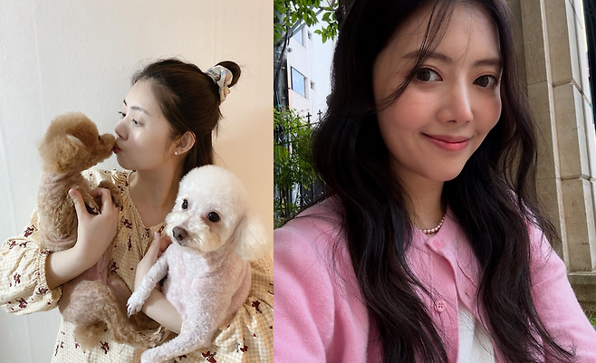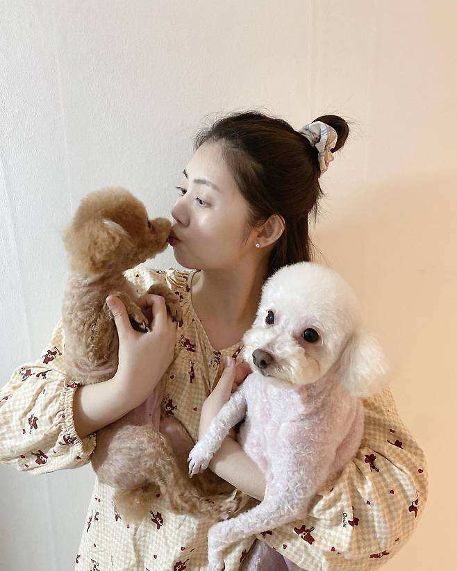 정윤혜의 내추럴 홈웨어 스타일을 살펴보겠다. 그녀는 연한 체크 패턴에 귀여운 곰돌이 프린트가 더해진 파자마를 입고, 두 마리의 반려견을 품에 안고 있다. 머리는 자연스럽게 올려 묶고, 스크런치로 포인트를 주어 편안하면서도 사랑스러운 분위기를 자아낸다. 전체적으로 따뜻하고 포근한 홈웨어 패션이 돋보인다.