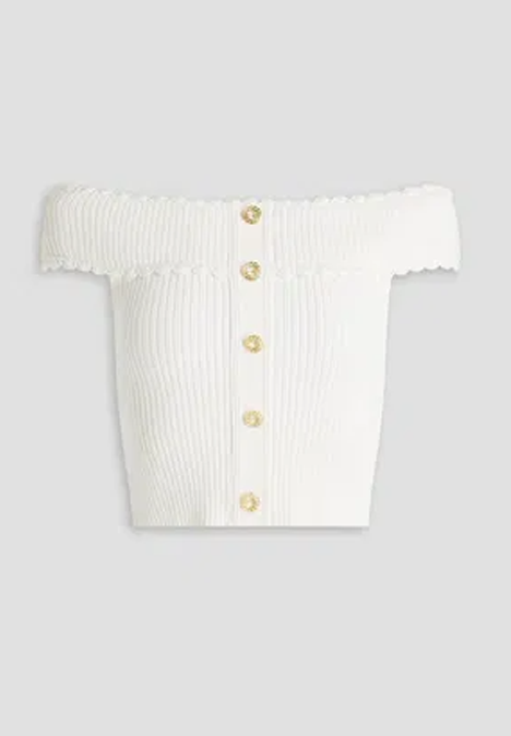 이날 그녀가 선택한 상의는 **산드로의 ‘오프 더 숄더 버튼 장식 리브 니트 크롭 탑’**이다.