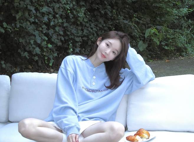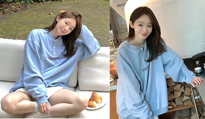 사진 속 강민경의 패션은 다리가 길어 보이는 '하의실종' 스타일링의 정석이었다. 넉넉한 핏의 '하늘색 헨리넥 맨투맨'이 상체를 포근하게 감싸주며,