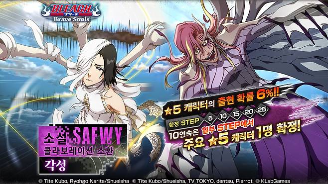 KLab 주식회사(대표이사 모리타 히데카츠, 이하 KLab)는 자사가 서비스 중인 PC 3D 액션 게임 'BLEACH: Brave Souls'(블리치 브레이브 소울즈, 이하 '브레이브 소울')가 소설 SAFWY(Spirits Are Forever With You) 컬래버레이션 소환 '각성'을 31일 오후 4시부터 시작한다고 밝혔다.