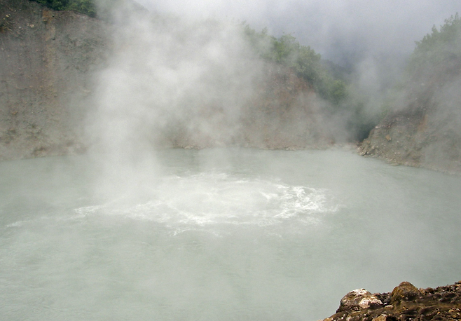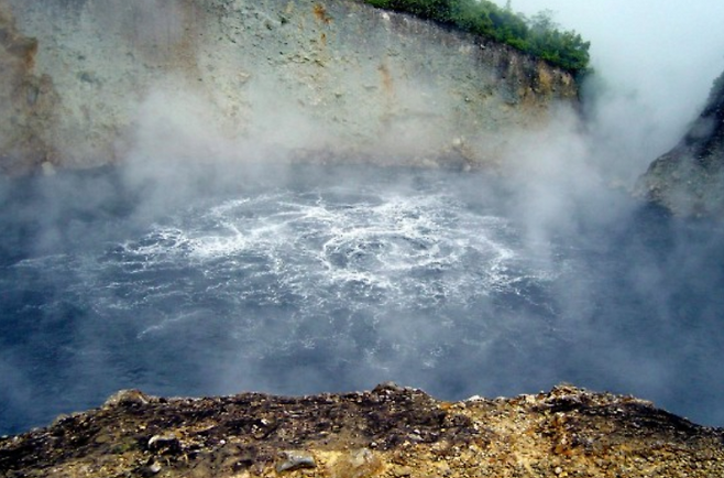 온천과 화산의 분기공에서 뿜어나오는 유황가스로 물빛이 뿌연게 특징이며 끓는 청회색의 물은 수증기에 가려 보이지 않아 화상을 입기 쉽습니다. 또 호수의 가스로 인해 사람이 사망한 일도 있었습니다.