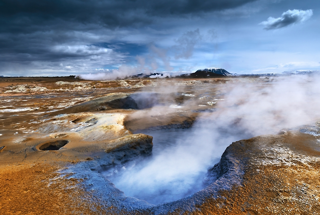 아이슬란드의 크라플라 산 바로 밑에 있는 화산지대인 나마프얄 화산은, 화산 활동이 매우 활발한 곳입니다. 이곳에는 독한 유황가스 냄새가 코를찌르며 가뭄에 든 논바닥처럼 쩍쩍 갈라진 대지 바로 옆에 크고 작은 머드팟이 움푹 패어있습니다.
