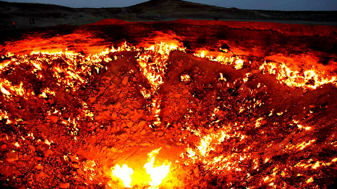 중앙아시아에 있는 투르크메니스탄의 사막 한복판에는 40년 넘게 꺼지지않는 불타는 지옥문이 있습니다. '지옥의 문'은 1971년 구소련 지질학자들이 천연가스 채취용 구멍을 뚫다 지반이 무너지며 발생한 불구덩인데요. 구멍이 생긴뒤 유독가스가 나오는것을 막기위해 불을 붙였으나 예상과 달리 불은 40여년째 꺼지지 않고 타고 있습니다.