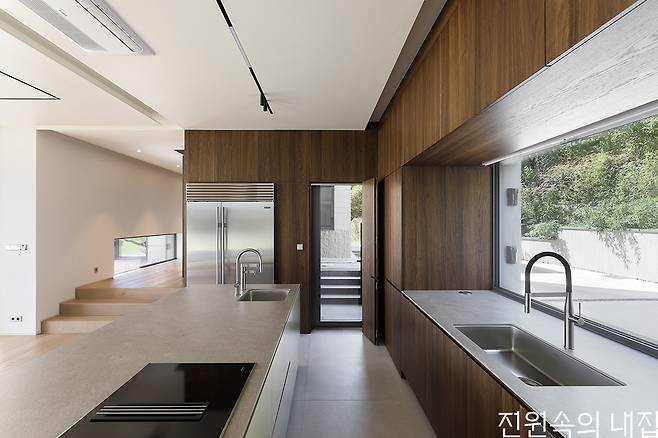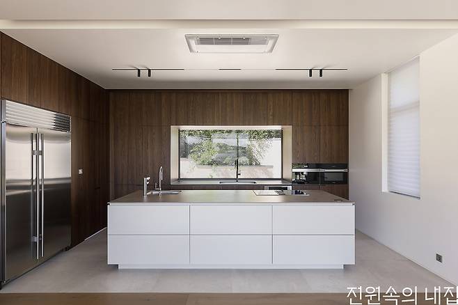 “조화로움이 가장 중요하다고 생각했어요.” 집을 지으면서 인테리어 분야에 본격적으로 관심을 두었다는 아내는 마감재와 가구 등을 고를 때 서로 자연스럽게 어우러지는 것을 첫 번째 포인트로 삼았다. 그는 인테리어를 진행한 루크디자인의 이은주 실장과 소통하며 취향을 살리는 동시에 완성도 또한 높일 수 있도록 많은 도움을 받았다고 전했다. 특히 주방의 모습에는 많은 변화가 있었다. 처음 설계를 진행할 때는 보조 주방을 따로 적용해 전체적으로 공간이 협소했는데, 이은주 실장의 제안으로 중앙에 아일랜드 조리대를 두고 뒷마당 쪽으로 싱크대 공간을 구성해 깔끔하고 실용적인 공간이 완성됐다. 여기에 주방 창의 크기를 키워 뒷마당의 대나무숲이 액자 속 작품처럼 보이도록 계획했다. 아일랜드 조리대에서는 중정과 데크를 향해 열린 다이닝 공간의 창밖 풍경도 내다볼 수 있다.