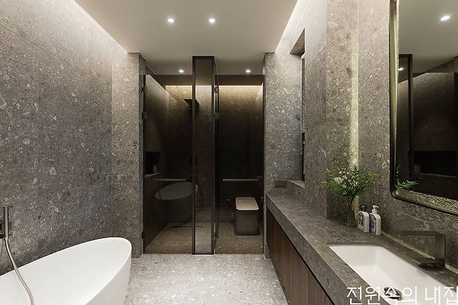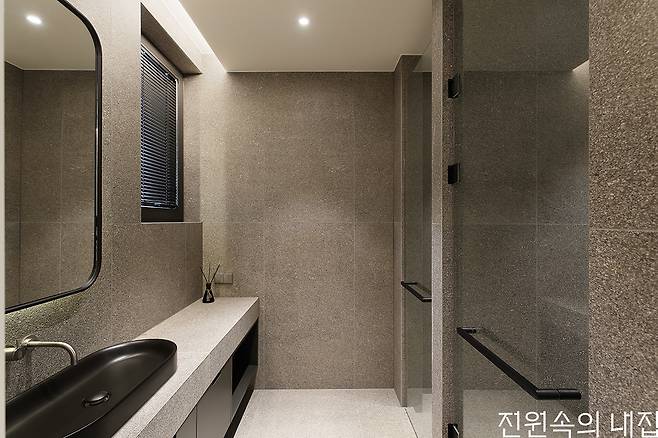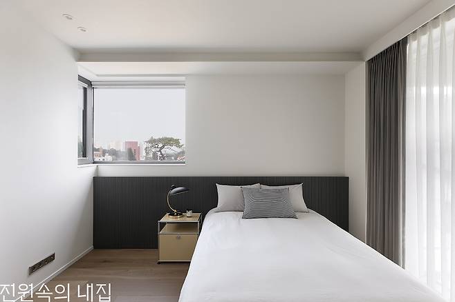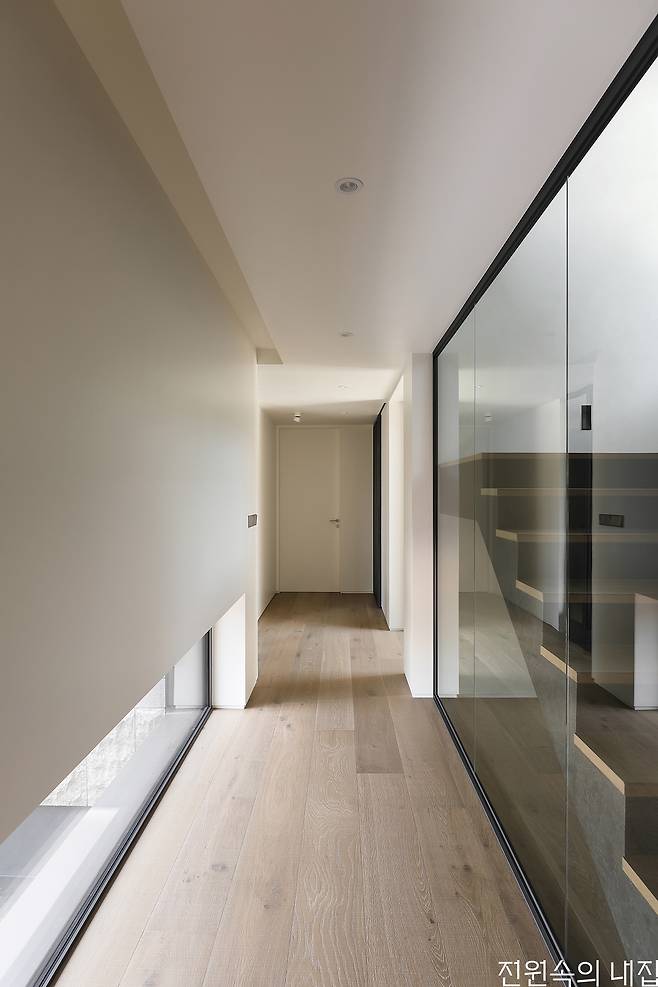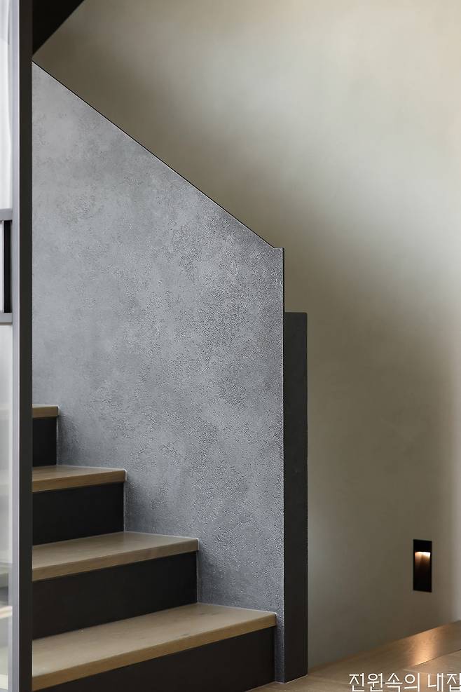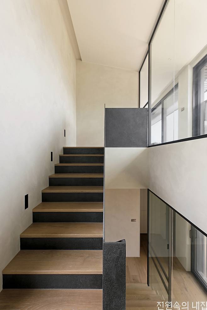 한편 유니크한 매력으로 존재감을 발휘하는 계단실은 남편이 가장 심혈을 기울인 공간이다. 집을 방문한 손님들이 가장 인상 깊은 공간으로 꼽는 곳이기도 하다. 계단과 난간을 금속 철판으로 제작한 후, 그 위에 돌의 질감을 살릴 수 있는 스페셜 블랙 페인트로 마감했다. 벽 또한 비슷한 질감과 톤으로 마감해 통일성을 이루고 있다. 계단실과 복도 사이에는 위험을 방지하기 위해 유리 가벽을 세웠고, 2층과 3층 계단실에는 유리 가벽과 슬라이딩 도어를 설치해 에너지 효율도 고려했다. 가벽과 도어의 프레임은 금속을 발색 제작해 더욱 고급스러운 분위기로 완성됐다.