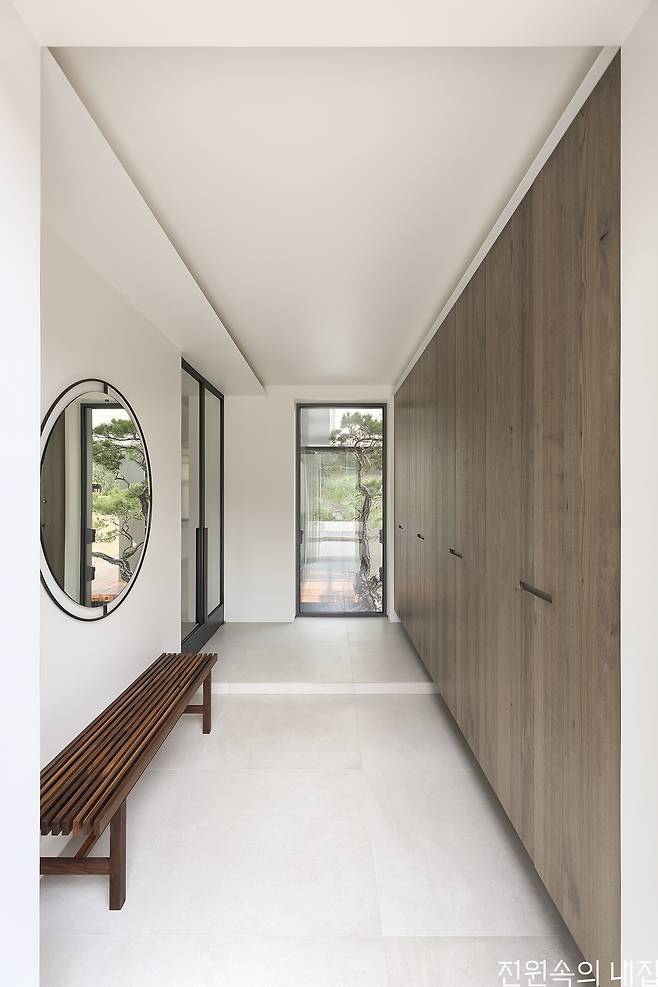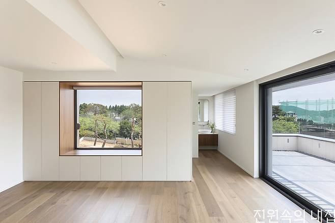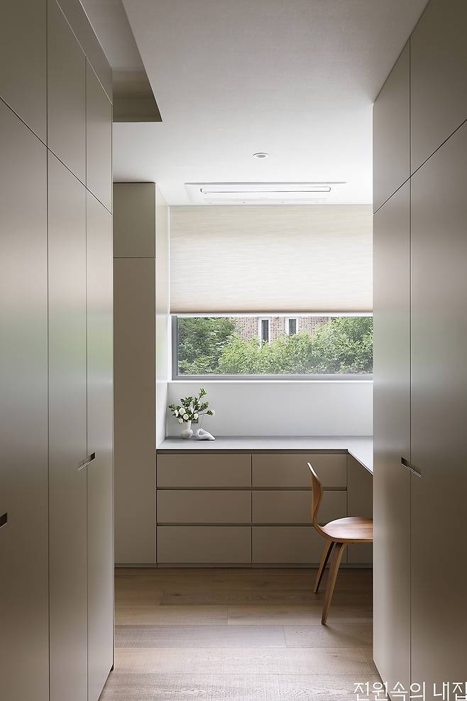 주방뿐 아니라, 집 주변의 아름다운 경관을 담아내는 창과 이를 활용한 인테리어 포인트들이 이곳저곳 다양하게 적용되어 있다. 현관에는 러프한 느낌의 건식무늬목으로 신발장을 제작해 정면의 창을 통해 보이는 소나무와 외부 정원이 실내에서도 이어지도록 연출했다. 정원과 유럽풍의 마을 풍경이 내려다보이는 3층의 창 주변에는 수납을 겸하는 윈도우 시트가 있어 한층 안락하게 경치를 즐길 수 있다.