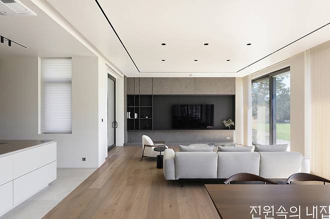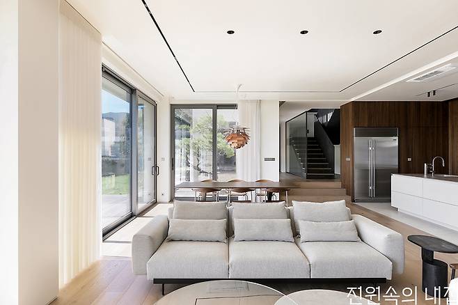 세컨드 하우스를 고려하고 있었던 건축주 부부는 고민 끝에 아예 아파트 대신 주택에서의 삶을 시작해 보기로 했다. 넓은 정원의 풍경이 어우러지는 집으로 들어서면 부부와 아들, 세 가족의 취향을 담은 공간이 펼쳐진다. 차분한 아이보리 컬러 배경 위에 어두운 톤으로 포인트를 주어 중심을 잡고, 원목을 다양하게 활용해 안락하면서 고급스러운 인테리어 디자인을 적용했다. 1층에는 거실과 주방 그리고 게스트룸이, 2층에는 부부와 아들의 침실 공간이 구성되어 있다. 멀티룸으로 사용되는 3층에는 두 개의 테라스와 간이 주방 공간이 있어 상황마다 다양하게 활용할 수 있다.
