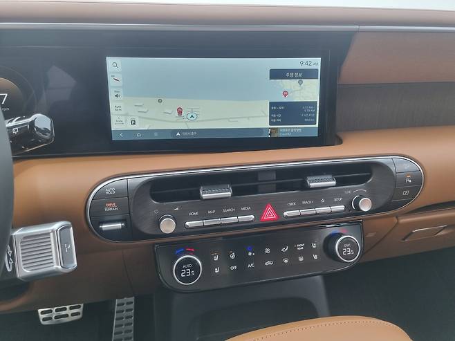 디스플레이는 현대차그룹의 다른 차량들과 달리 대시보드 안쪽으로 몰아 넣었다. 햇빛 반사로 화면이 안 보일 일은 없었다. 가죽소재로 센터페시아 곳곳을 라운딩 처리해 전체적으로 아늑한 느낌을 준다. 요즘처럼 겨울엔 더 그랬다.