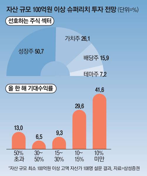 19일 매일경제신문이 삼성증권과 함께 자산규모 100억원 이상 슈퍼리치 108명을 대상으로 실시한 설문조사 결과 63.9%가 연말 및 내년에 국내·외 주식 비중을 늘리겠다고 답했다. 또 주식 투자 비중을 늘리겠다고 답한 고액 자산가 중에선 성장주 투자를 선호한다는 의견이 50.7%로 과반수를 넘었다. 가치주, 배당주 선호 의견이 각각 26.1%, 15.9%로 그 뒤를 이었다. 테마주 투자가 효율적이란 소수 의견(7.2%)도 있었다.