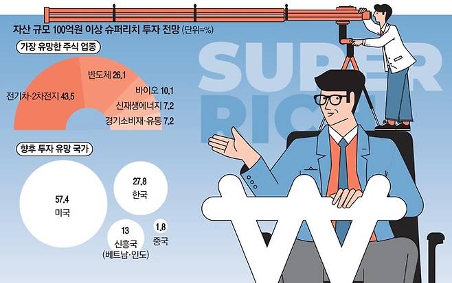 한 PB는 “2차전지를 제외하고 슈퍼리치 순매수 상위 종목을 보면 반도체주인 삼성전자, SK하이닉스, 이수페타시스가 포착된다”며 “슈퍼리치들은 미국 증시 종목 중에선 테슬라, 엔비디아, 마이크로소프트를 좋아한다”고 말했다. 그 밖에 바이오(10.1%), 경기소비재 및 유통(7.2%), 신재생에너지(7.2%) 업종을 유망하게 보는 시선도 있다.
