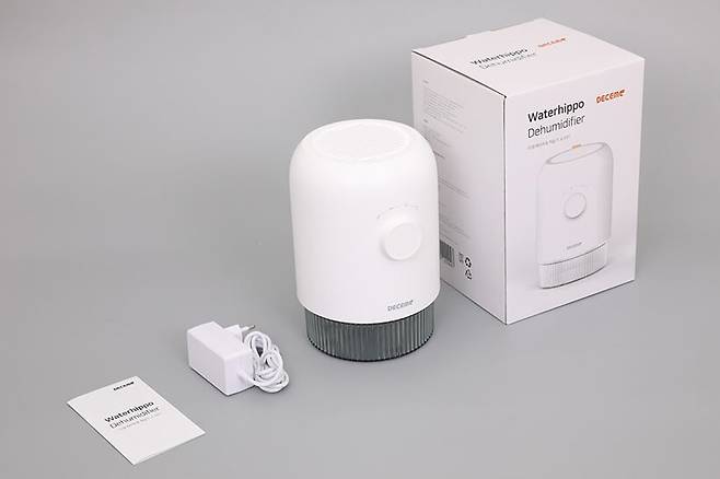 박스를 열면 발포 완충재로 구성품들이 안전하게 담겨 있으며, 디셈 미니제습기 JL-D01 본체와 전원 어댑터, 사용 설명서가 기본 제공된다.
