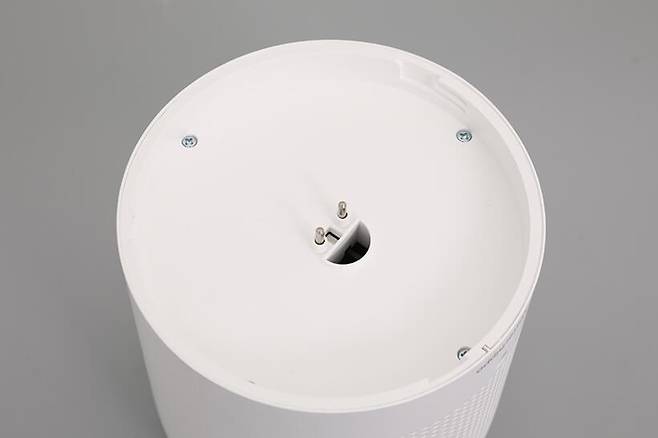본체 뒷면에는 전체적으로 넓게 타공되어 있는 부분이 보이는데, 습기를 머금은 공기를 본체 내부로 빨아들이는 흡입구이다. 흡입구 바로 아래에는 동그란 전원 단자가 위치해 있다.