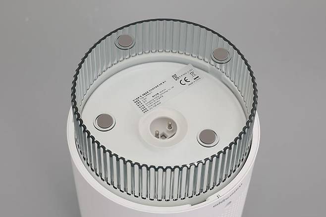 본체 아래쪽에는 투명한 재질의 물통이 끼워져 있는데, 물통을 잡고 본체를 살짝 돌리면 물통을 분리해낼 수 있다. 물통 윗면에는 흰색 커버가 씌워져 있으며, 이곳에 모인 수분이 물통으로 흘러 들어갈 수 있도록 가운데 구멍이 뚫려 있다.