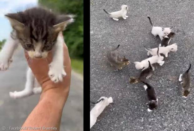 그는 차를 돌려서 한쪽에 세운 후, 자신에게 다가온 회색 얼룩고양이 1마리를 안았다. 그 순간 풀숲에서 새끼고양이 3마리가 튀어나와, 그에게 달려왔다. 그게 끝이 아니었다. 풀숲에 숨어 있다가 그를 향해 달려 나온 새끼고양이들은 무려 12마리나 됐다!