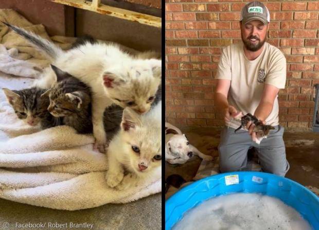 로버트 브랜틀리는 졸지에 새끼고양이 13마리를 돌보게 됐다. 그는 최근 페이스북에 새끼고양이 스카우트를 목욕시키는 영상(오른쪽)도 공개했다. 옆에서 반려견이 낯설게 그를 지켜보고 있다.