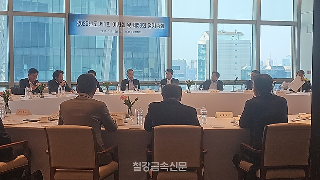 한국철강협회가 7일, 서울 포스코센터 서관 19층 스틸클럽에서 2025년도 제1회 이사회 및 제58회 정기총회를 가졌다. 이날 행사에는 협회로 복귀한 동국제강그룹의 철강 자회사 대표들과 강성욱 신임 협회 전무도 참석해 업계인들에게 인사하는 자리를 가졌다.