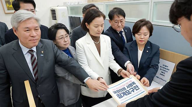 서왕진 원내대표는 오늘 징계안을 제출한 뒤 기자들과 만나 "서 의원은 지난달 27일 사법개혁 법안 처리 방해를 위해 국민의힘 의원들과 (본회의장) 단상을 점거하고 이를 영상으로 기록하던 이 의원을 피켓으로 가격했다"고 밝혔습니다.