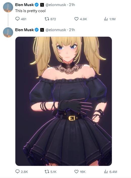 머스크는 “꽤 멋지다(This is pretty cool)”는 글과 함께 고스풍 애니메 소녀의 사진을 공유하기도 했다.