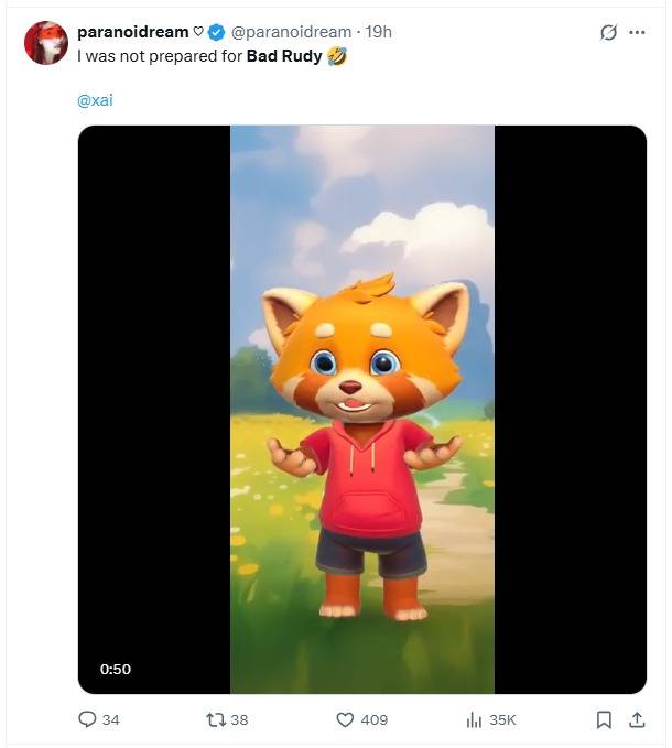 머스크가 직접 공유한 게시물에 따르면, 현재 이용 가능한 AI 동반자는 최소 두 명으로 보인다. 하나는 꽉 조인 코르셋과 짧은 검정 드레스를 입고 허벅지까지 올라오는 망사 스타킹을 신은 금발 양갈래 머리의 고스 애니메 소녀 ‘애니(Ani)’이며, 다른 하나는 3D 여우 캐릭터 ‘배드 루디(Bad Rudy)’다.