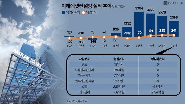미래에셋컨설팅의 과거 손익계산서 내역을 봐도 같은 모습을 나타낸다. 2023년에도 영업이익은 235억원을 기록했지만, 영업외손익은 12배에 육박하는 2778억원을 거뒀다. 2022년 당시에도 영업이익은 191억원에 불과했지만, 영업외손익은 16배에 달하는 3072억원을 기록했다.