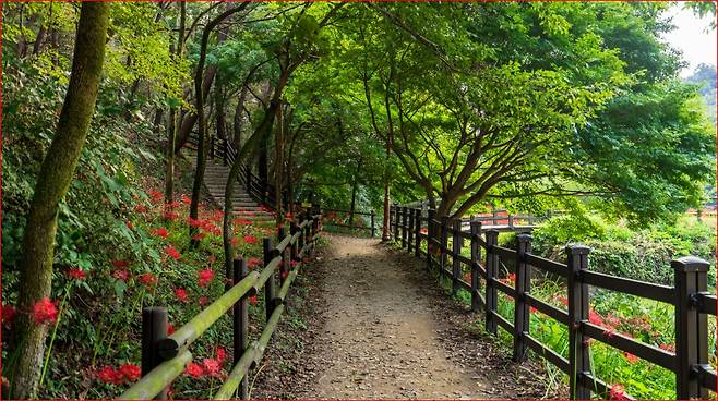 용천사 숲길 : 꽃무릇이 길 양옆으로 가득 피어 ‘붉은 터널’을 형성