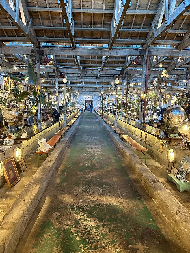 문을 열고 들어서면, 벽과 바닥에 남아 있는 방직공장 시절의 모습들이 곳곳에서 반겨줘요. 낡은 기계 부품과 공장 설비를 그대로 두고, 테이블·의자·인테리어 소품을 어우러지게 배치해 독특한 레트로 분위기를 만들었죠. 마치 오래된 박물관을 구경하는 듯한 느낌이 들면서도, 곳곳에 앉아 차 한 잔을 즐길 수 있는 ‘카페’의 역할을 잊지 않는다는 게 매력이에요.