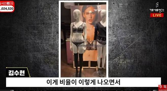 공개된 영상에서 김수현은 속옷만 입은 여자 마네킹을 찍으며 "김 유튜버다. 저는 빤스 브라자 앞에 있다. 이런게 없다"라고 말했다. 친구가 "한국에도 있다"라고 답하자, 김수현은 "아니 이런 몸이 없다고. 비율이 이렇게 나오면서 간지가 나면서.. 이걸 어떻게 본받아야 되지?"라고 말했다.