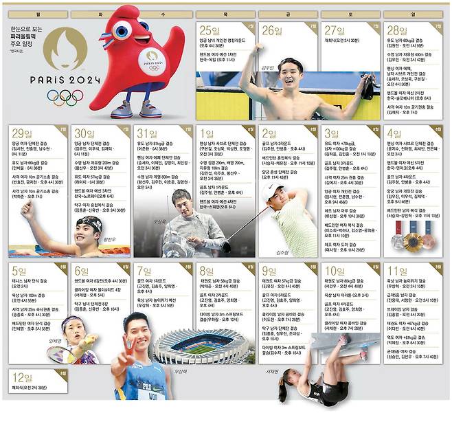 김우민은 지난해 항저우아시안게임에서 수영 3관왕(자유형 400m·800m, 계영 800m)에 오르며 한국 수영 간판으로 떠올랐다. 같은 날 펜싱 여자 에페 송세라, 남자 사브르 오상욱, 유도 남자 60㎏급 김원진도 메달을 노린다. 임시현, 전훈영, 남수현으로 구성된 여자 양궁 대표팀은 7월 29일 올림픽 단체전 10연패에 도전한다. 여자 양궁은 1984년 LA대회부터 2021년 도쿄대회까지 9회 연속 올림픽 단체전 금메달을 따내며 금자탑을 쌓았다.