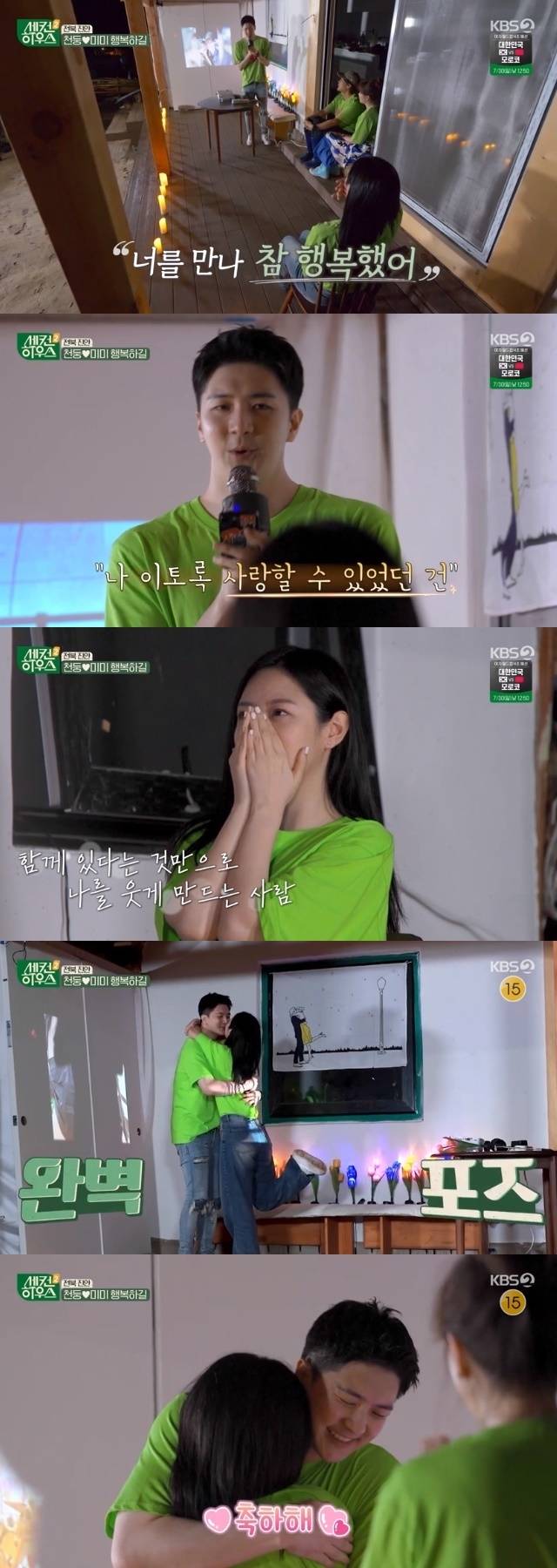 집에 돌아온 미미는 집에 들어서자마자 "오, 뭐예요?"라며 깜짝 놀랐다. 이윽고 빔 프로젝트에 자신들의 4년 간의 비밀 연애 당시 사진들이 나오고, 천둥이 폴킴 '너를 만나'를 프러포즈 송으로 부르자 울음을 터뜨렸다. 수줍게 노래 부르던 천둥 역시 목메인 듯 몇 소절의 노래 가사를 놓치는 모습을 보였다. 최수종은 미미보다 더 감동 받은 표정으로 이를 지켜봤다.