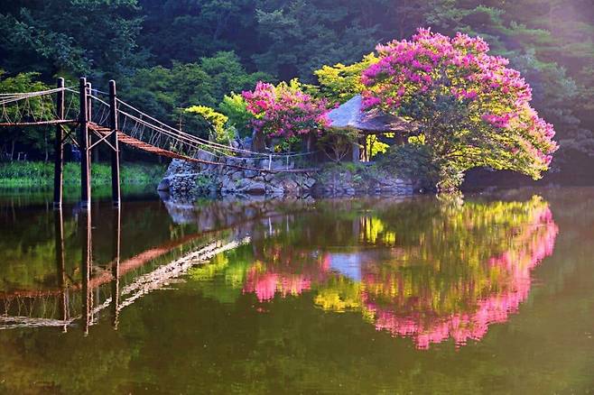 배롱나무가 풍성하게 핀 작은 섬과 저수지를 가로지르는 출렁다리, 신묘한 분위기를 자아내는 물안개가 어우러져 마치 한 폭의 그림 같은 풍경을 선사한다.