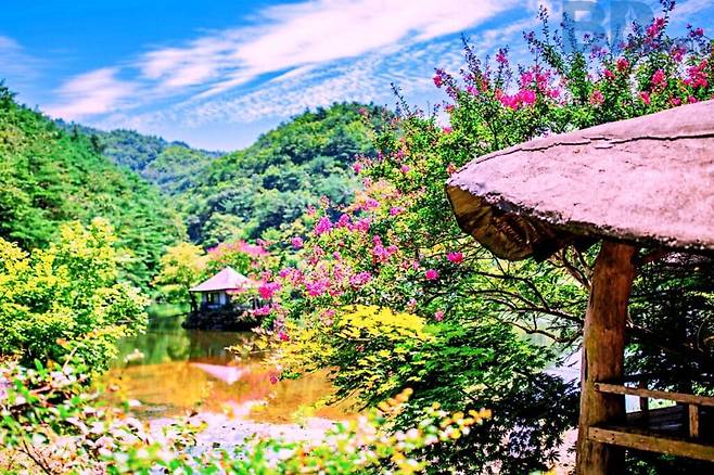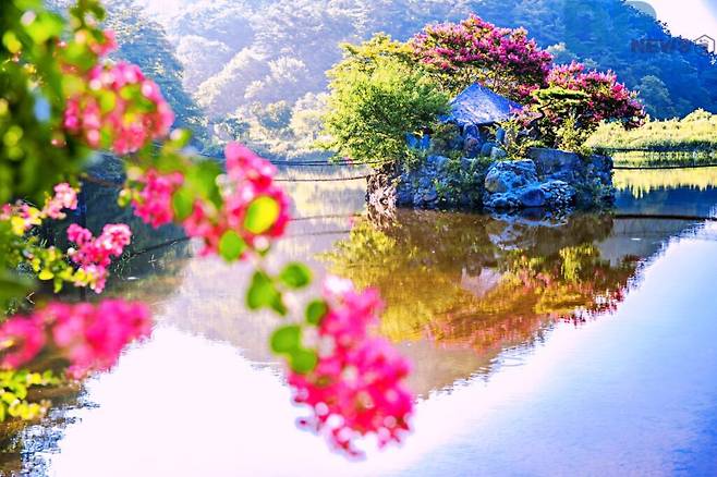 또한 저수지 수면에 배롱나무와 푸른 숲의 경치가 거울처럼 반사되어 더욱 몽환적인 분위기를 자아낸다.