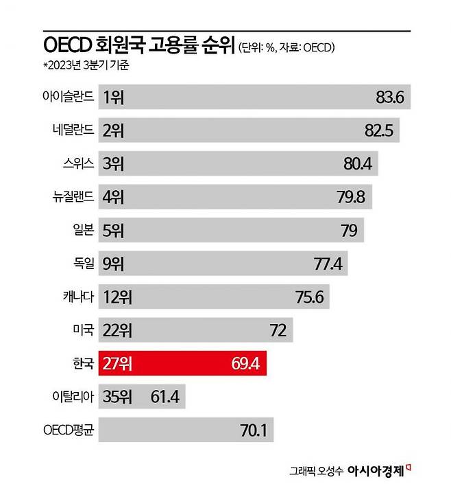 지난해 3분기 OECD 40개 회원국 중에서 한국의 고용률 순위는 27위로 2021년 기록한 30위에서 순위가 상승했지만 여전히 하위권에 머물고 있다. 고용을 더 늘려야 한다는 지적이 나오는 이유다.